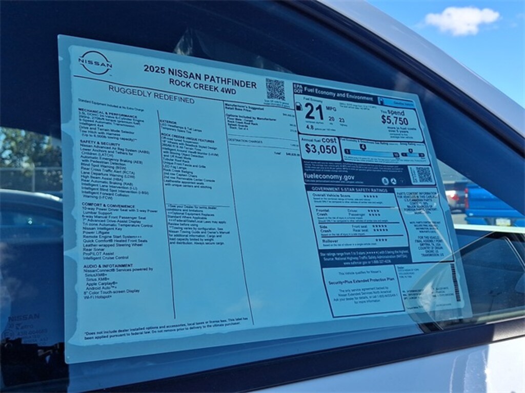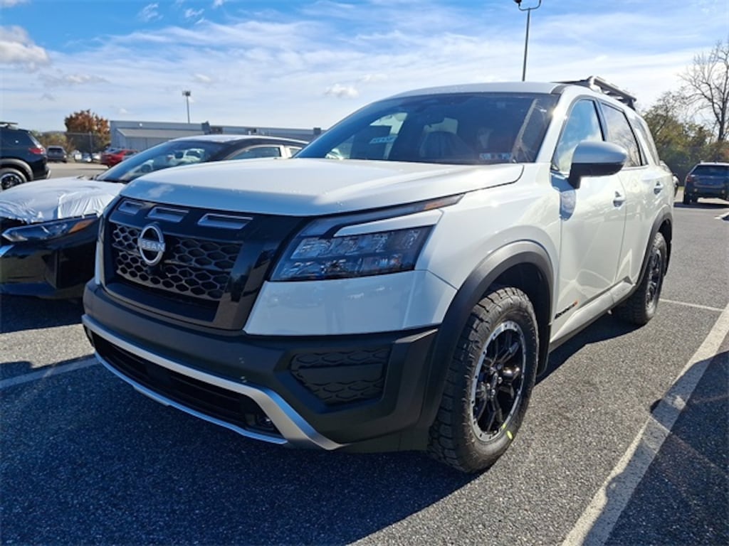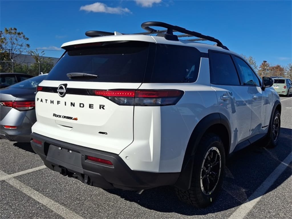 Pathfinder Rock Creek, 4D Sport Utility, 3.5L V6 DOHC, 9-Speed Automatic, 4WD, Glacier White, Charcoal, NissanConnect featuring Apple CarPlay and Android Auto, Rock Creek AS Floor Liners & Cargo Area Protector, Rock Creek Roof Rack, Roof rack. 4D Sport Utility 2025 Nissan Pathfinder Rock Creek Rock Creek Glacier White