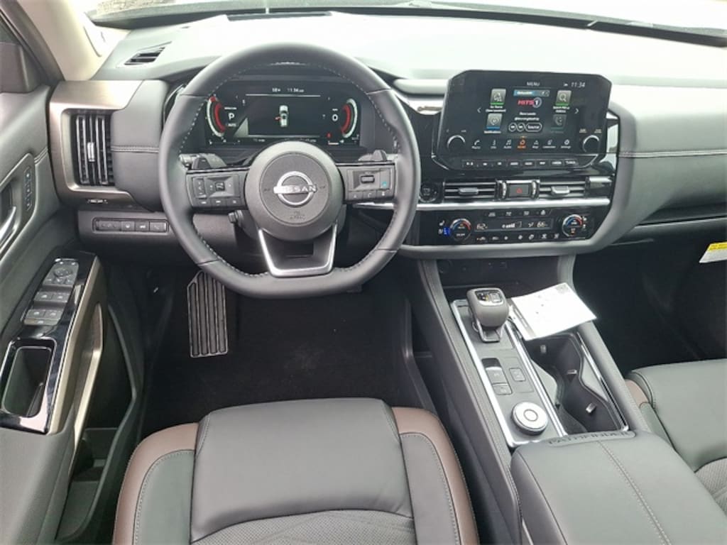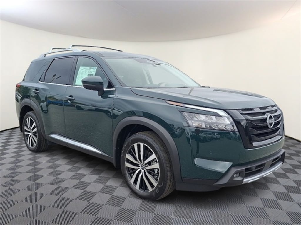 Pathfinder Platinum, 4D Sport Utility, 3.5L V6 DOHC, 4WD, Green Pearl, Charcoal Leather, Black Appearance Package, Black Grille, Black Liftgate Emblems, Bose Premium Audio System, Cross Bars, Navigation system: NissanConnect with Navigation and Services, Power Liftgate, Power moonroof, Wheels: 20" x 8J Machined Alloy. 4D Sport Utility 2025 Nissan Pathfinder Platinum Platinum Green Pearl