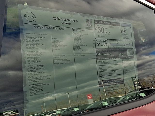2026 Nissan Kicks SV Scarlet Kicks SV, 4D Sport Utility, AWD, Scarlet, Charcoal Cloth, Cold Weather Package, Heated Front Seats, Heated Mirrors, NissanConnect featuring Apple CarPlay and Android Auto, Rear Floor Heater Ducts.