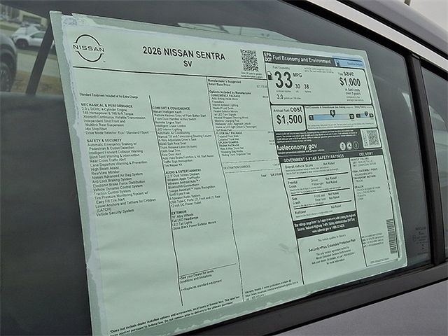 2026 Nissan Sentra SV Gun Metallic Sentra SV, 4D Sedan, 2.0L I4 DOHC, CVT with Xtronic, FWD, Gun Metallic, Charcoal Cloth, 16" Machined Alloy Wheels, 6 Speakers, Ambient Lighting, Auto Diming Inside Mirror, Floor Mat Package, Heated Exterior Mirrors, Heated Front Seats, Heated Steering Wheel, Hide-A-Way Trunk Net, I-Key with Approach Unlock All Plus Walk Away Lock, Soft Knee Pad, SV Convenience Package, Synthetic Leather Steering Wheel, Trunk Package, Visor DR/AS w/LED Light, Wireless Charging For Personal Devices.